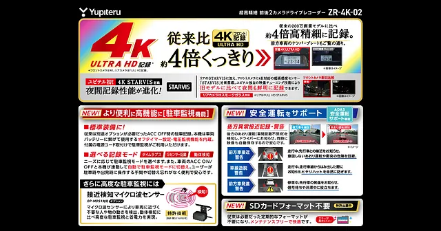 ユピテル指定店モデルの前後2カメラドライブレコーダー「ZR-4K-02」は、記録画質に徹底的にこだわったハイエンドモデル。