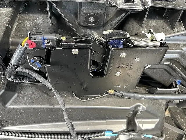 写真のようにフランク内部を分解し、純正ラッチ部を加工・交換しながら取付を行います。
