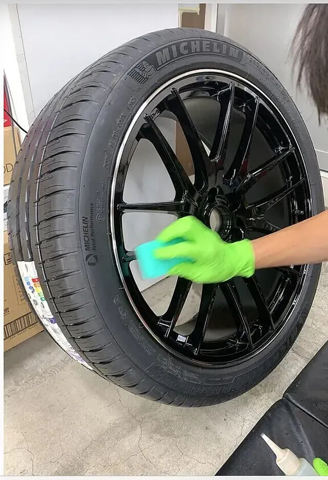 車両よりホイールを取り外して表面と裏面同時施工も出来ます。