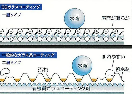 CQガラスコーティングは、最先端コーティング樹脂「有機ポリシラザン」を配合することによって、今まで困難であった無機と有機を結合させた最先端のガラスコーティングです。