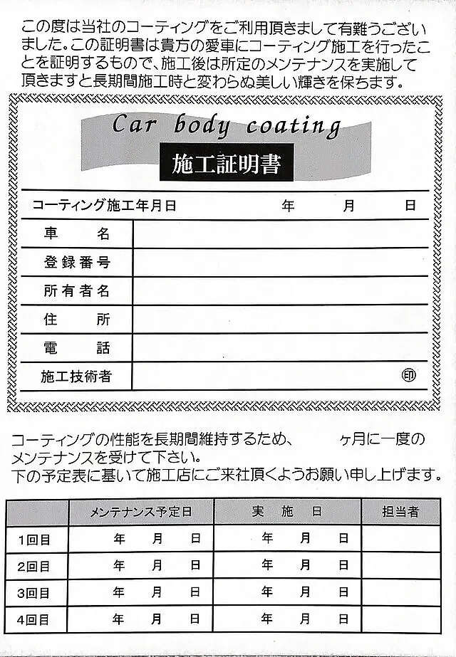 当店でガラスコーティングを施工したお車には施工証明書を発行しております。